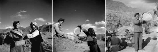 三張圖片是西藏軍區後勤部組織“毛澤東思想宣傳隊”,到拉薩東郊納金鄉的打場幫農民收青稞的場景。這個宣傳隊由西藏軍區的女兵和西藏軍區後勤部下屬的汽車修配廠的女工組 成。圖一、圖二正在幫農婦幹活的是同一人,因佩戴五角星帽徽和領章,是西藏軍區的女兵,漢人,名字不詳。下圖這個正在篩青稞的漂亮女青年不是女兵,而是在汽修廠當工人的阿努,生於拉薩的藏人。她身後兩個與農婦坐在一起的女子,是來自天津的 “支邊青年”,也是修配廠的工人, 其中一人外號叫“小辣椒”。“支邊” 即“支援邊疆”的意思。阿努很早就與我的父母相識,她說工人不能戴帽徽領章。