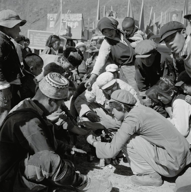 由軍隊醫務人員組成的巡迴醫療隊,到缺醫少藥的鄉村給貧窮的老百姓義務看病。此乃最得人心的舉措,多少補救了文革後期極其糟糕的軍民關係。照片上正在給婦人滴眼藥、給女孩打針的女兵,是西藏軍區總醫院的護士拉姆,其實我在總醫院出生時正是她接生的,她在入伍前是成立於一九五○年代的“西藏地方幹部學校”(簡稱“藏幹校”)的學生,與我母親是同學。這個學校是中共為培養所謂的“藏族幹部”而設,後來大多數在西藏的公安、檢察院和法院任職。