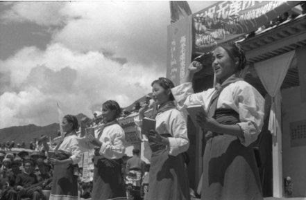不知道這是自治區歌舞團還是話劇團的演員,正在拉薩街頭載歌載舞,向廣大“翻身農奴”激情洋溢地宣傳文化大革命。以藏人演員爲主、以感恩新西藏、批判舊西藏的內容爲主的演出團體,有西藏歌舞團、西藏話劇團、西藏藏劇團,於一九五八年、一九六二年分別成立。文革期間,因爲傳統藏戲被貶低爲“四舊”, 藏劇團一度停止演出,一九七二年重建,專門演出新編所謂的革命藏戲,如《解放軍的恩情》、《紅燈記》等,今天亦繼續新編、演出所謂的京劇藏戲《文成公主》