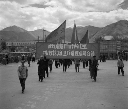 在各種標語和旗幟中,有一幅寫着“交通廳職工子弟學校紅衛兵”。該校建立於一九六一年,專門爲中國各地入藏的交通系統的職工子女而辦,位於布達拉宮西面德吉路北段,如今名爲拉薩市第三中學。